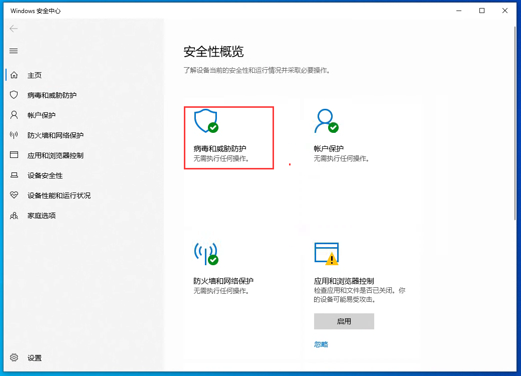 4、Windows Defender安全中心提供了病毒和威脅防護、賬戶保護、防火墻和網絡保護、應用和瀏覽器控制、設備安全性、設備性能和運行狀況、家庭選項等多種安全功能。
