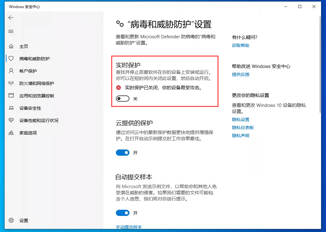 6、把“實時保護”關閉。(如果有安裝第三方防護軟件會看不到實時保護選項,需先將安全衛(wèi)士退出)