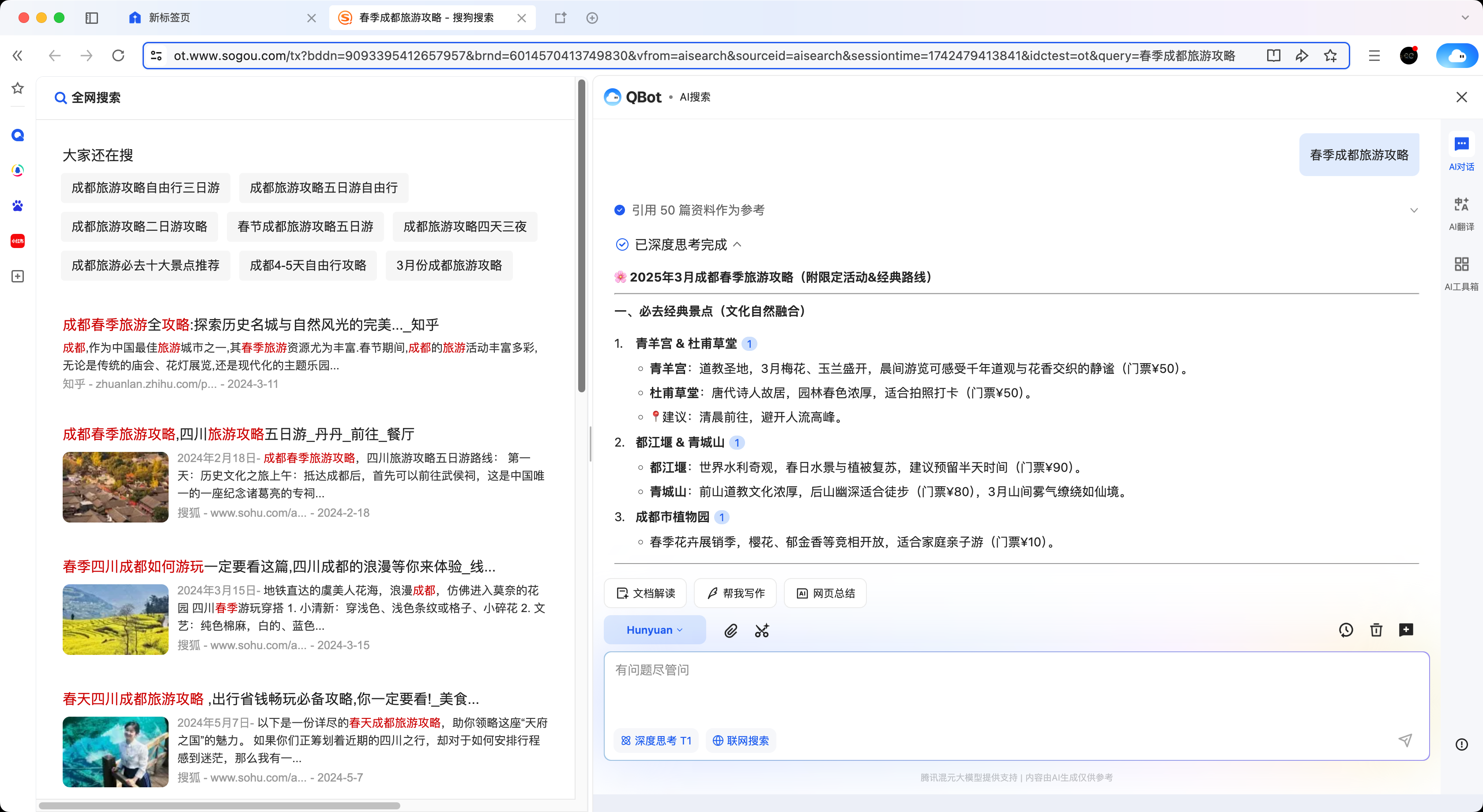 (1)右側為AI搜索結果,可進一步查看引用文章、深度思考過程。