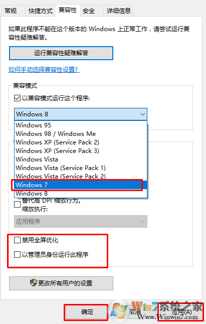 4、使用win7的兼容性運行此軟件,有時候不兼容的情況也會導(dǎo)致電腦出現(xiàn)藍屏,右鍵程序圖標--屬性---兼容性選項卡--將兼容性選擇為win7系統(tǒng),并將以管理員權(quán)限運行等勾選