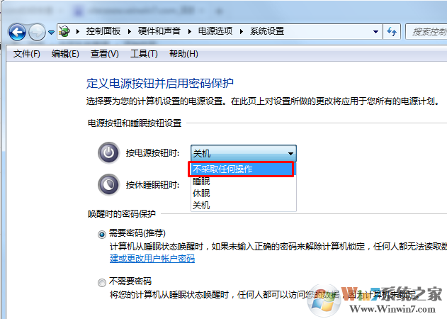 4、打開(kāi)“選擇電源按鈕的功能”后,我們?cè)?ldquo;按電源按鈕時(shí):”后面的“用電池”和“接通電源”的下拉菜單中,分別選擇“不采取任何操作”。