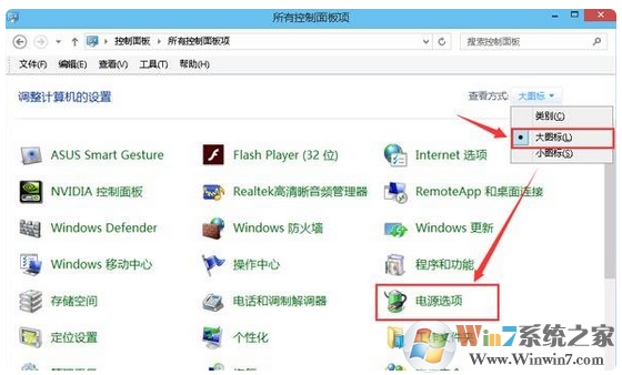2、在 控制面板的查看方式里選擇“大圖標(biāo)”,然后在下方找到“電源選項(xiàng)”,點(diǎn)擊;