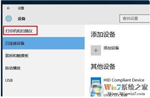 3、在“設(shè)備”對(duì)話框里面選擇點(diǎn)擊“打印機(jī)和掃描儀”。