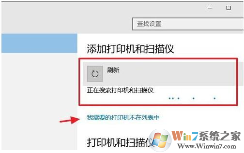 5、我們點(diǎn)擊上面的“添加打印機(jī)或掃描儀”,然后可以看到正在搜索已經(jīng)物理連接的打印機(jī),如果有的話, 可以搜索到,如果搜不到,也可以手動(dòng)添加,點(diǎn)擊“我需要的打印機(jī)不在列表中”。
