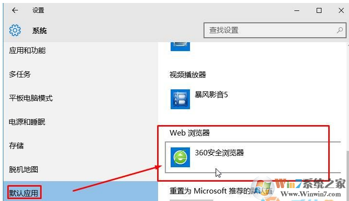 4、在系統(tǒng)左側(cè)點(diǎn)擊“默認(rèn)應(yīng)用”,在右側(cè)找到“Web瀏覽器”,在下面設(shè)置需要設(shè)置為默認(rèn)的瀏覽器即可。