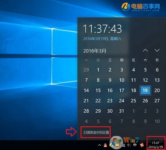 1、首先點(diǎn)擊Win10桌面右下角的“時(shí)間”,在彈出的時(shí)間詳細(xì)界面,點(diǎn)擊打開(kāi)“日期和時(shí)間設(shè)置”如圖。