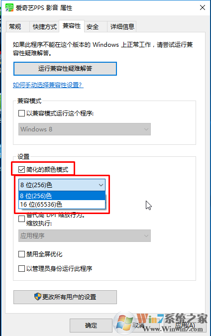 2、右鍵點(diǎn)擊快捷方式,選擇屬性,然后切換到兼容性選項(xiàng)卡下!勾選“簡(jiǎn)化的顏色模式”,選擇16位色;(這里還有更低的8位色哦)