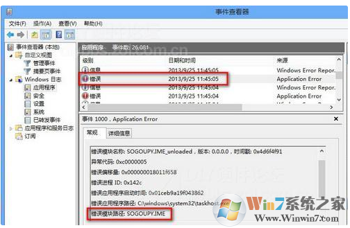 2、依次展開(kāi)左側(cè)的“windows日志”---“應(yīng)用程序”,右側(cè)根據(jù)錯(cuò)誤提示對(duì)話框出現(xiàn)的時(shí)間查找錯(cuò)誤日志記錄。每個(gè)錯(cuò)誤記錄跟隨一個(gè)“信息”日志。點(diǎn)擊“錯(cuò)誤”,下面會(huì)顯示詳細(xì)信息,“錯(cuò)誤模塊”即記錄出現(xiàn)錯(cuò)誤的程序。我們只要記住自己出現(xiàn)問(wèn)題的時(shí)間點(diǎn),然后在日志中找到相應(yīng)時(shí)間的錯(cuò)誤信息