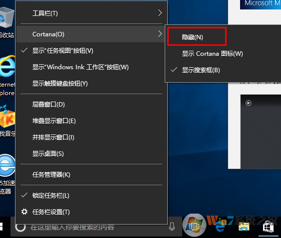 1、右鍵點(diǎn)擊任務(wù)欄小娜(Cortana)搜索框,
