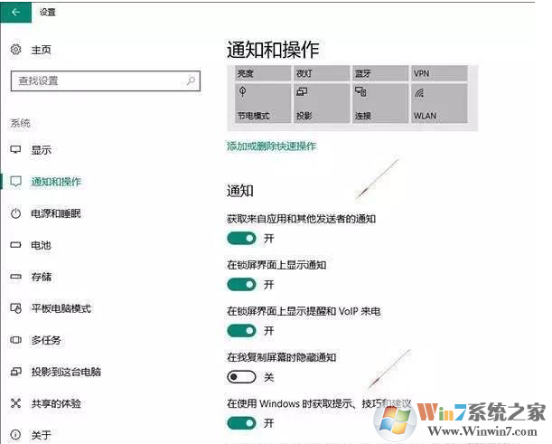 還有一些廣告,是出現(xiàn)在win10通知中心的,同樣我們也有一些方法控制它。比方說(shuō)在“設(shè)置”→“系統(tǒng)”→“通知和操作”下,便有“獲取來(lái)自應(yīng)用和其他發(fā)送者的通知”、“在使用Windows時(shí)獲取提示、技巧和建議”兩項(xiàng)開(kāi)關(guān)控制它。