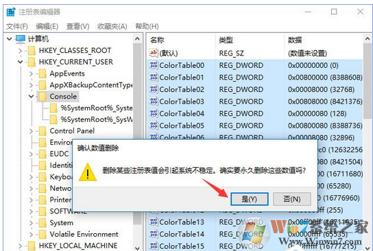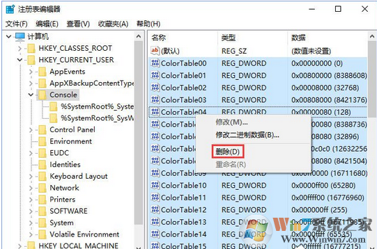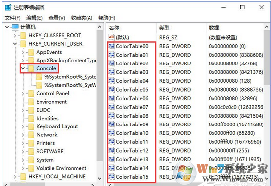2、將注冊表轉(zhuǎn)至HKEY_CURRENT_USER\Console項,找到右側(cè)的ColorTable00~ColorTable15,并選中,如圖。