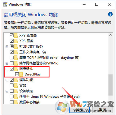 4、點擊啟用或關(guān)閉Windows功能后,會彈出Windows功能對話框,拉到最下面,點擊“+”展開“舊版組件”,勾上“DirectPlay”,再點擊確定。