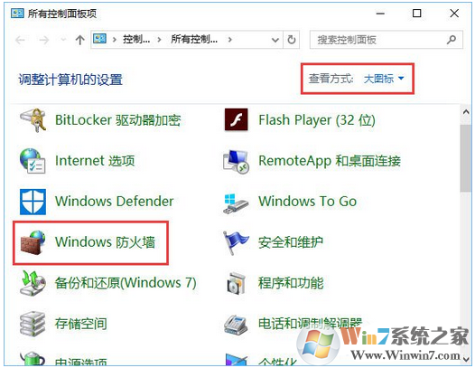 2、點(diǎn)擊Windows防火墻(現(xiàn)將查看方式改成大圖標(biāo),即可找到);