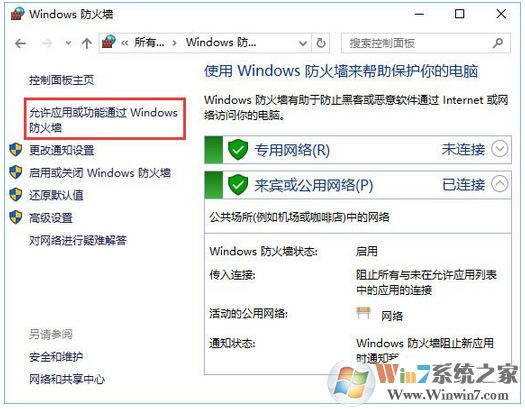 3、點(diǎn)擊窗口左側(cè)的【允許應(yīng)用或功能通過(guò)Windows防火墻】;
