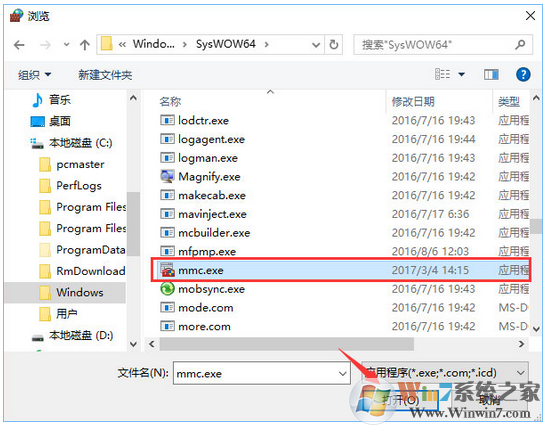 7、定位到C:\Windows\System32 (64位系統(tǒng)定位到C:\Windows\SysWOW64),找到mmc.exe,找不到的話先打開(kāi)該路徑,然后在右上角搜索 mmc.exe 選中后點(diǎn)擊打開(kāi);