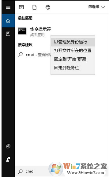 1、按Win+S打開搜索框,在搜索框中輸入cmd,在列表中右鍵命令提示符選項(xiàng)“以管理員身份運(yùn)行”并打開。