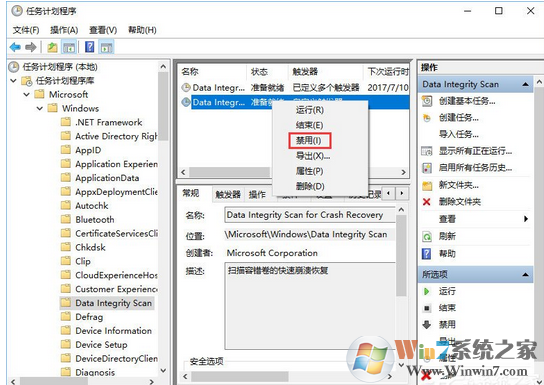 3、在左側(cè)依次展開(kāi):Microsfot\Windows\Data Integrity Scan ,在右側(cè)的“DataIntegrity Scan for Crash Recovery”上單擊右鍵,選擇【禁用】;