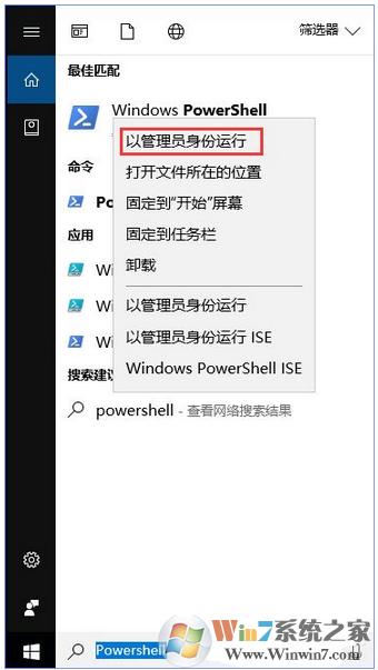 3、在小娜搜索Powershell,在Windows Powershell上單擊右鍵選擇【以管理員身份運行】;