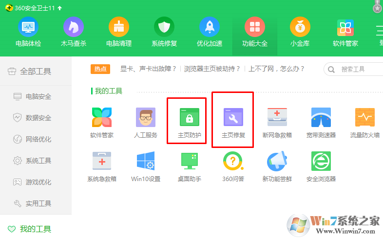 1、打開360安全衛(wèi)士,打開功能大全,選擇主頁修復(fù)一下。