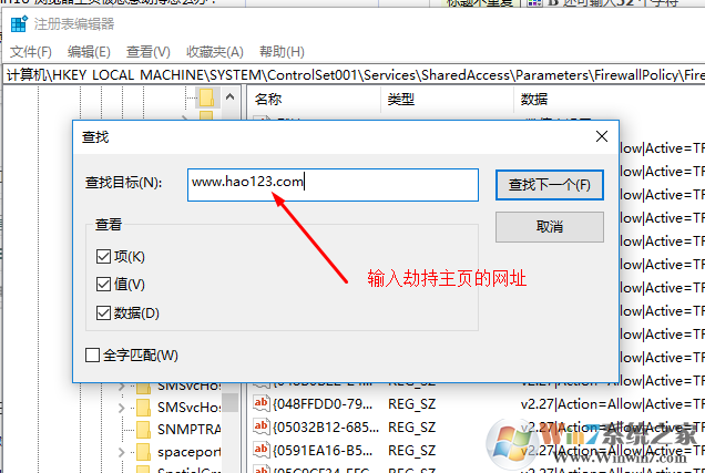 3、在搜索框中輸入劫持首頁的網(wǎng)址,然后點擊查找,刪除所有找出來的項、值。
