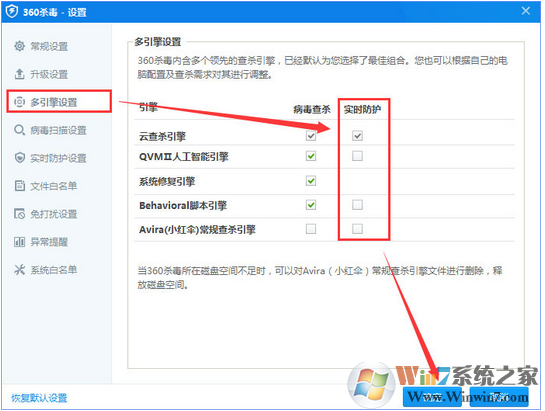 2、點擊【多引擎設置】,在右側(cè)將所有實時防護的勾去掉;