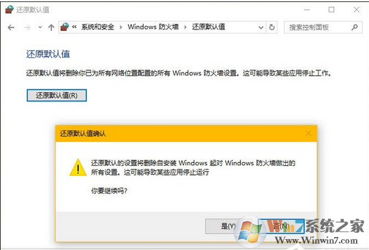 3、完成操作后,Windows 防火墻 就可恢復(fù)為默認(rèn)設(shè)置和規(guī)則。當(dāng)然,需要允許網(wǎng)絡(luò)訪問的系統(tǒng)功能和應(yīng)用程序就需要你重新手動添加和調(diào)整了。