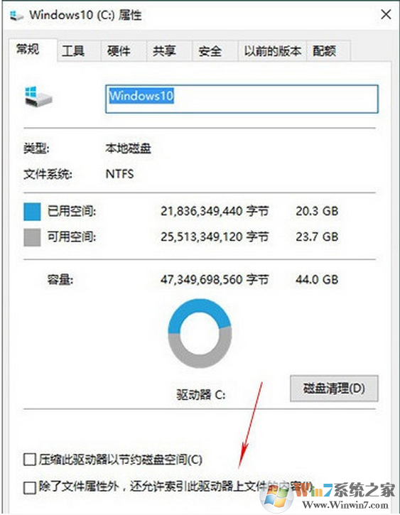 接下來打開“此電腦”,右擊磁盤屬性,取消“除了文件屬性外,還允許索引此驅(qū)動(dòng)器上文件的內(nèi)容”前面的復(fù)選框即可。每個(gè)盤需要重復(fù)這一步。