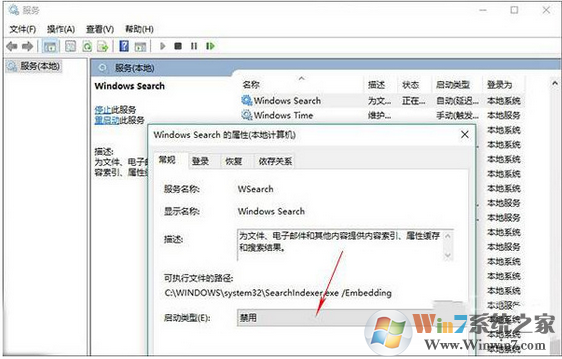 點(diǎn)擊Cortana搜索框,輸入“服務(wù)”進(jìn)入本地服務(wù)列表,查找并雙擊“Windows Search”,將其屬性修改為“禁用”。