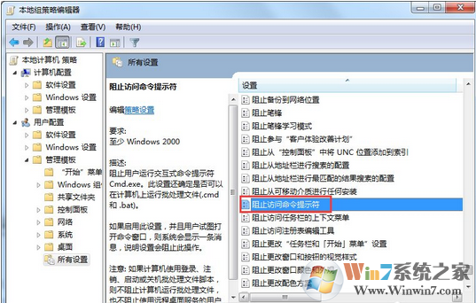 3、滑動菜單到底部位置,找到“阻止訪問命令提示符”選項并雙擊將其打開,如圖所示:
