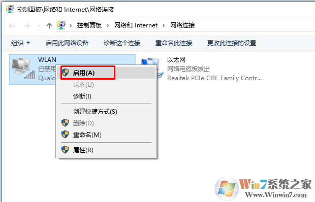 4、我們要找的是WLAN的連接,右鍵點(diǎn)擊它,選擇"禁用",待圖標(biāo)變成灰色后,再次將其"啟用",這樣,無(wú)線網(wǎng)就可以重新連接了。