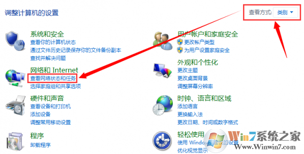 1、右鍵點(diǎn)擊開(kāi)始菜單,打開(kāi)控制面板,在查看方式為"類(lèi)別"的狀態(tài)下,點(diǎn)擊"查看網(wǎng)絡(luò)狀態(tài)和任務(wù)",如下圖所示: