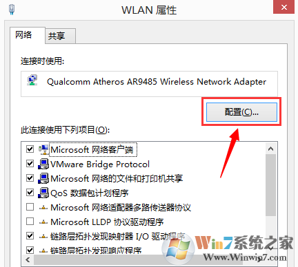 3、然后在打開(kāi)的WLAN屬性窗口中選擇“配置”:再在打開(kāi)的窗口中選擇“電源管理”選項(xiàng)卡:取消對(duì)“允許計(jì)算機(jī)關(guān)閉此設(shè)備以節(jié)約電源”的勾選,再點(diǎn)擊“確定”即可。
