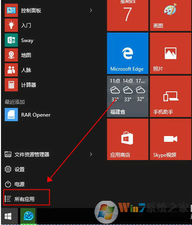 1、在系統(tǒng)菜單彈出的菜單欄里點(diǎn)擊所有應(yīng)用。