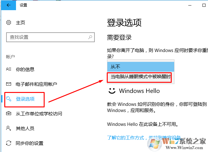 4、在需要登錄中選擇當(dāng)電腦從睡眠模式中喚醒,如果是相要取消開機(jī)密碼的朋友則選擇從不。