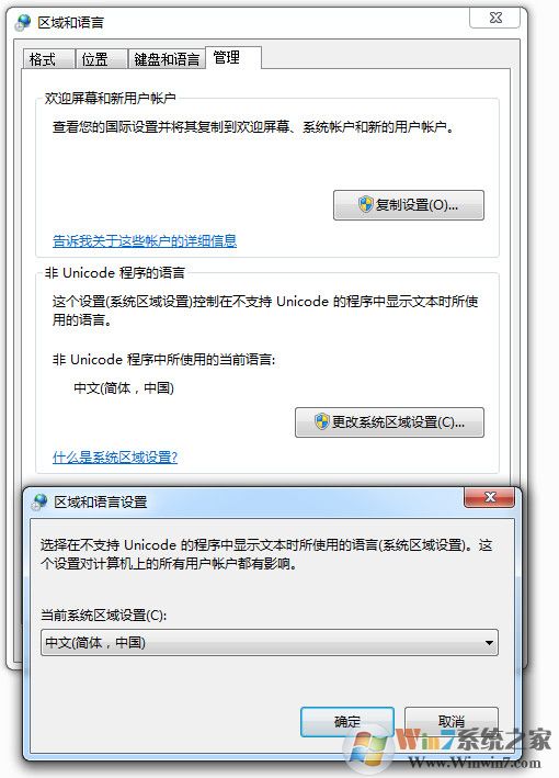 4、管理選項卡,非Unicode程序的語言,點擊“更改系統(tǒng)區(qū)域設置”,“當前系統(tǒng)區(qū)域設置”選擇中文(簡體,中國):