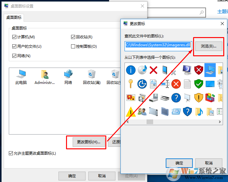 3、我們依次選中回收站(空)/(滿(mǎn)),點(diǎn)擊【更改圖標(biāo)】,如圖所示: