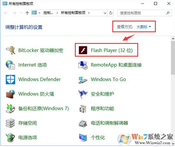 2、將右上角的查看方式修改為大圖標(biāo),在下面點(diǎn)擊Flash Player(32位);