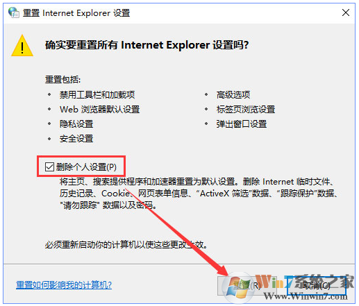 3、在重置 ie 設置框中,勾選【刪除個人設置】,點擊【重置】按鈕;
