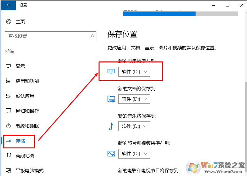 3、選擇存儲,然后將新安裝的應(yīng)用保存在---這項修改為D盤或者是非系統(tǒng)盤即可。