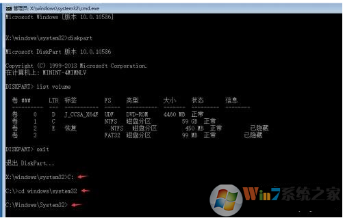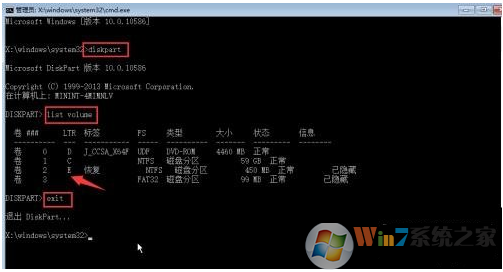 6、在管理員窗口輸入diskpart按下回車,再輸入list volume按下回車查看電腦有幾個(gè)硬盤,盤符是什么,我們的目的是確定C盤是哪一個(gè),輸入exit退出diskpart工具,如圖: