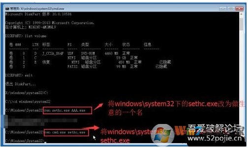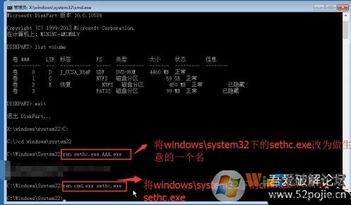 8、使用ren命令更改system文件夾下的兩全文件,一個(gè)是sethc.exe,另一個(gè)則是cmd.exe