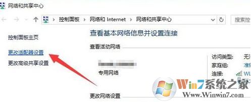 2、待進入“網(wǎng)絡(luò)和共享中心”界面后,點擊窗口左上角的“更改適配器設(shè)置”按鈕,如圖所示。