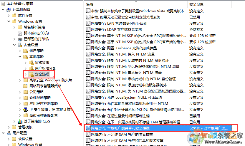 【本地策略】—【安全選項(xiàng)】—【網(wǎng)絡(luò)訪問:本地賬戶的共享和安全模型】