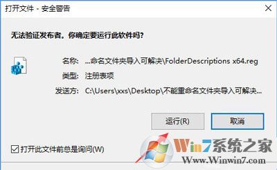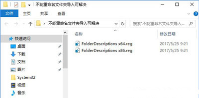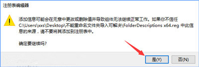 3、此時(shí)我們可以看到2個(gè)注冊(cè)表文件,如果你的系統(tǒng)是win10 64位的,雙擊運(yùn)行FolderDescriptions x64.reg,如果似乎win10 32位系統(tǒng),則雙擊運(yùn)行FolderDescriptions x86.reg,在彈出的框中點(diǎn)擊“是”即可。
