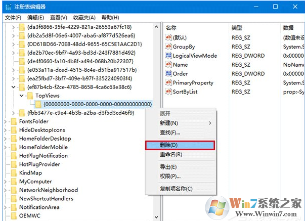 3、在{00000000-0000-0000-0000-000000000000}上單擊右鍵,選擇“刪除”;