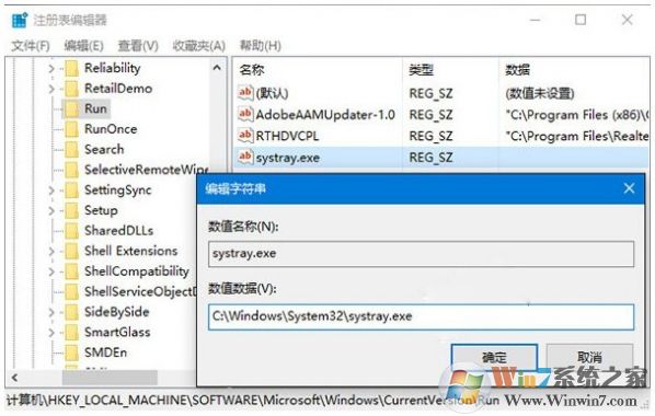 4、雙擊systray.exe鍵值,將其值修改為C:WindowsSystem32systray.exe,確定。
