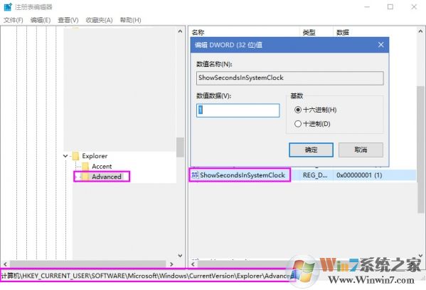 2、在右側(cè)窗口右鍵點擊新建 DWORD(32位)值,并命名為ShowSecondsInSystemClock,雙擊打開將數(shù)值數(shù)據(jù)改為1,然后重啟電腦即可。