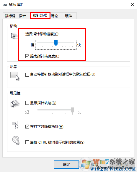 4、在鼠標(biāo)屬性中,切換到“指針選項(xiàng)”,然后對“指針移動(dòng)速度”進(jìn)行調(diào)節(jié),并勾選“提高指針精確度”選項(xiàng)。