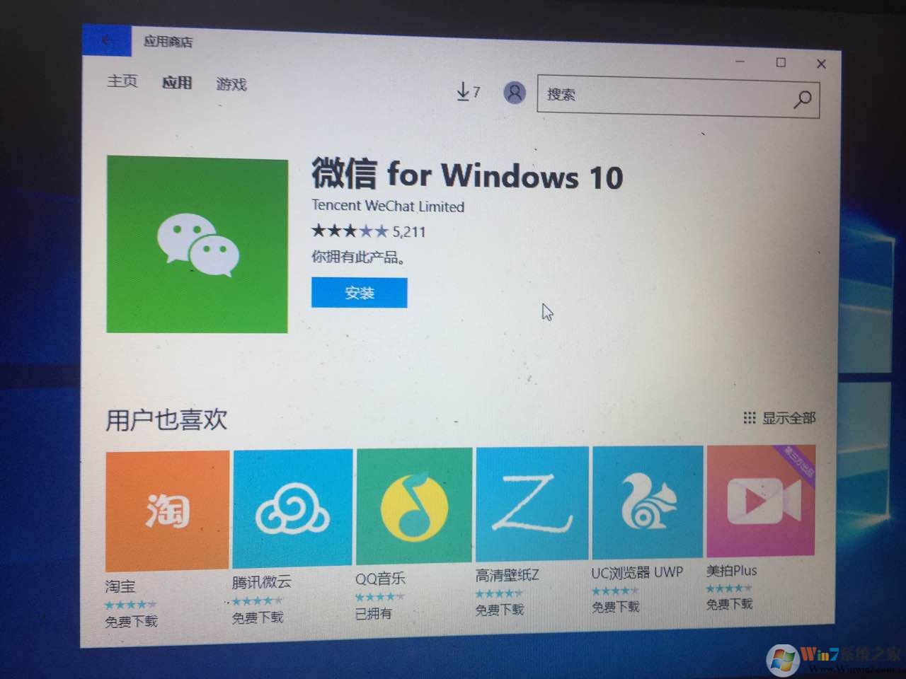 2、在win10系統(tǒng)應(yīng)用商店中安裝app版的微信。