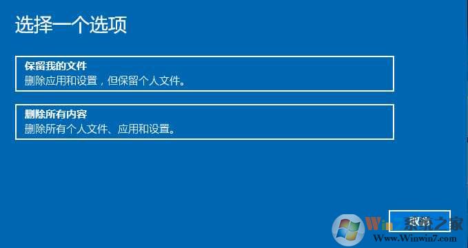 4、接下來會出現(xiàn)兩個選項“保留文件”和“刪除所有內(nèi)容”(如果是預裝的電腦還會有第三個選項“還原出廠設(shè)置”可以幫助你恢復到出廠時的系統(tǒng));